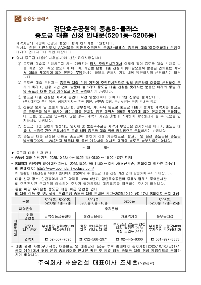 [5201동~5206동 우리은행]중도금대출 안내문